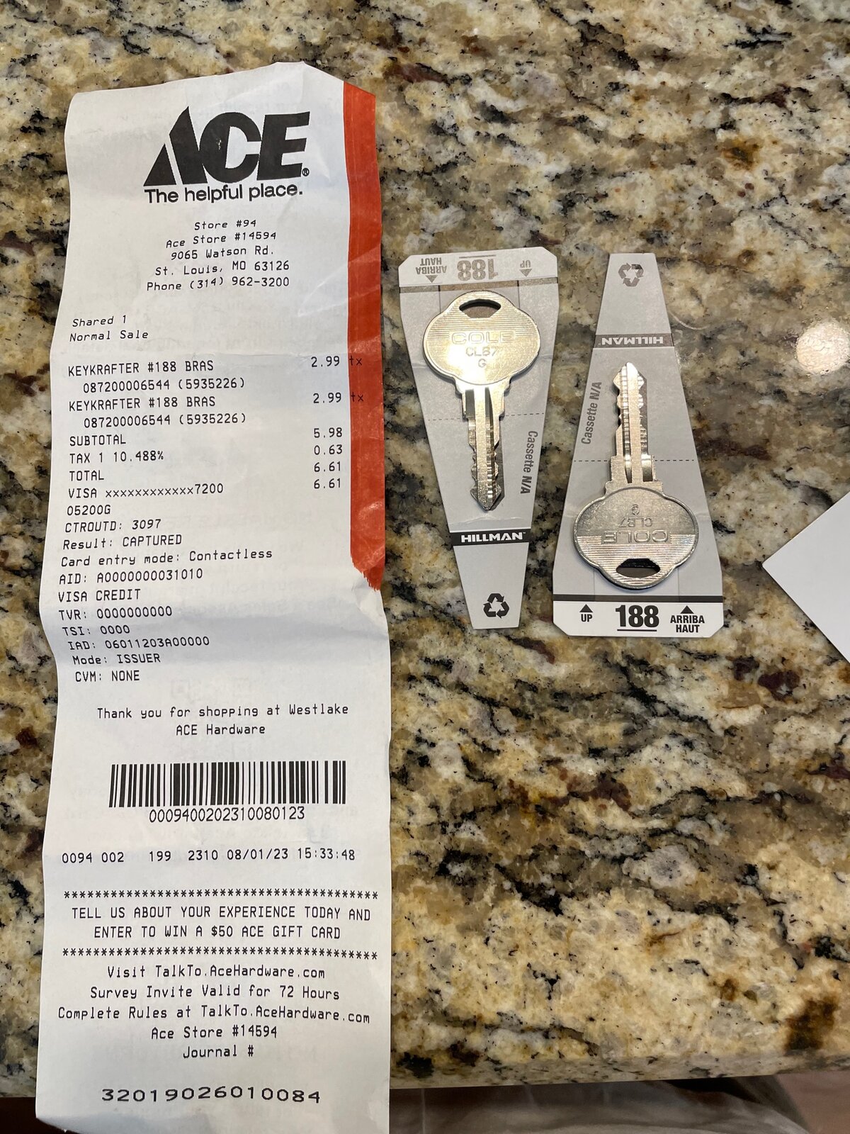 Sure enough, found a guy who knew what he was doing and he was able to match it to a Hillman 188 [he didn't even bother with atv/motorcycle keys]. Cut me 2 with a complete guarantee if they didn't work but they did. Best part: $3 a key and I like the 'head' of the key better: larger and more heft.